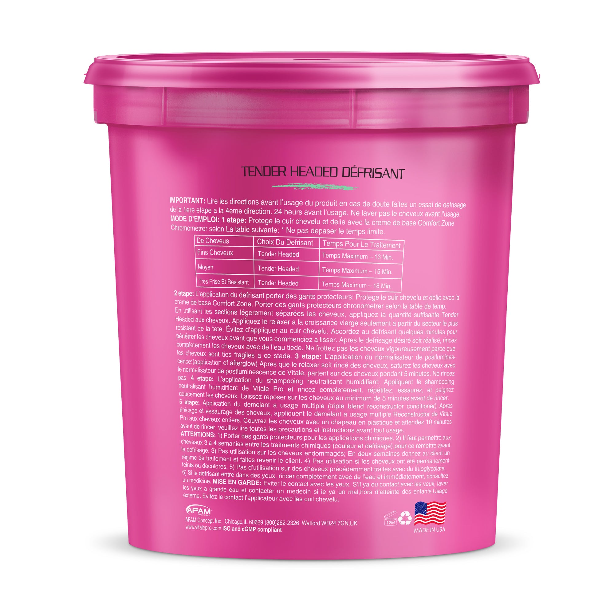 FR: L’alternative douce pour les cuirs chevelus sensibles, Tender Headed a une base d’hydroxyde de lithium. Le bas poids moléculaire et le pH inférieur de l’hydroxyde de lithium permet une pénétration haute vitesse. L’ajout d’aloès et de beurre de karité africain réduit le dommage aux cheveux et minimise l’irritation du cuir chevelu tout en rendant les cheveux doux et rebondissant avec un éclat radieux. Il conserve un reste de texture naturelle et fonctionne mieux avec des cheveux à la texture fine à moyenne et à la porosité normale.